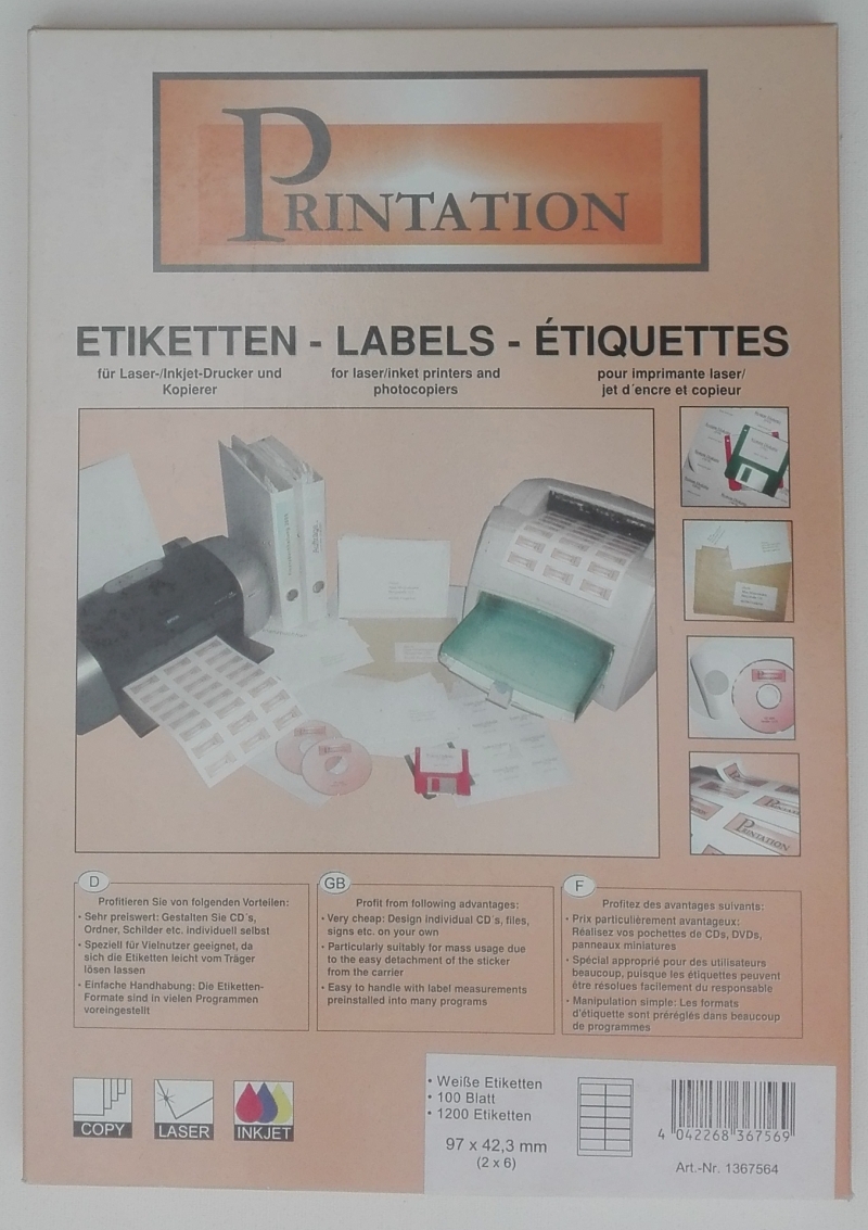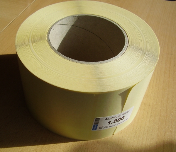 Falz-Etikett, Polyethylen Klebstoff Permanent Format 106 x 72 mm Anzahl: 2000 1-bahnig Farbe: weiß 2 orange Flächen linksbündig pro Etikett (HKS7) Bahnbreite 214mm 5 Kartons mit je 2000 Stück, Preis je Karton Euro 12.-